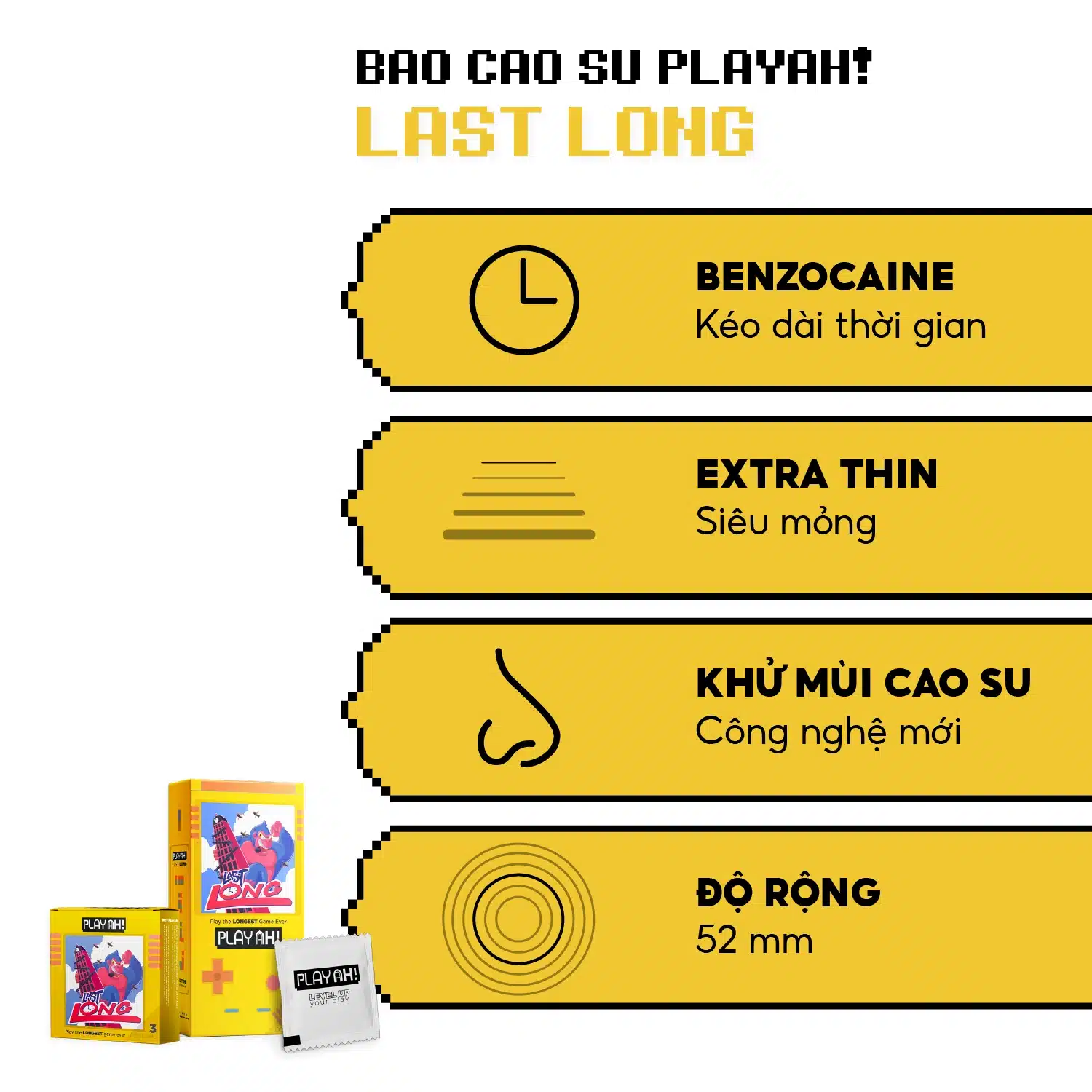 – BCS PlayAh Last Long Siêu Mỏng chính hãng với Benzocaine giúp kéo dài thời gian yêu, là bcs chống xuất tinh sớm khiến khoảnh khắc bên nhau là vô tận.