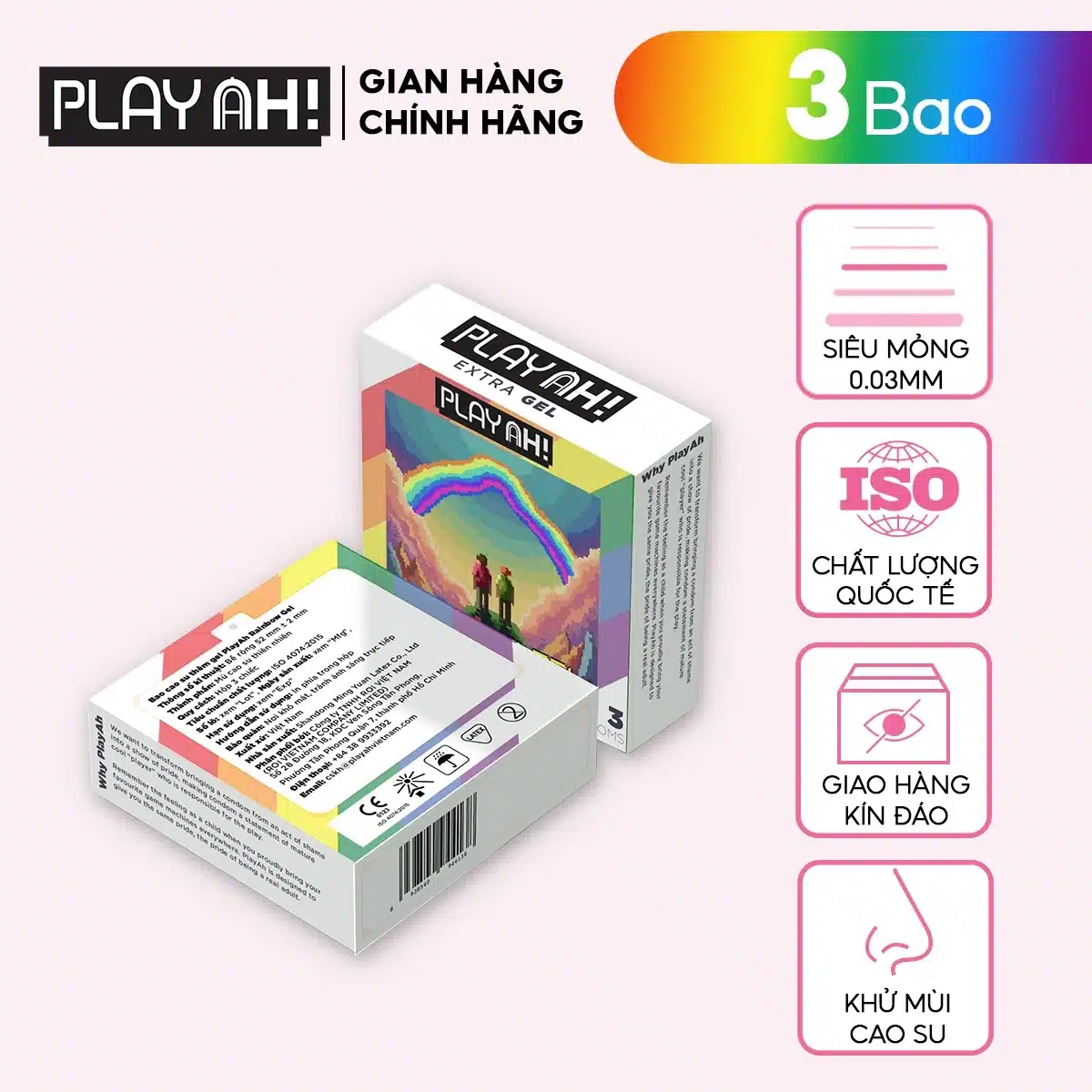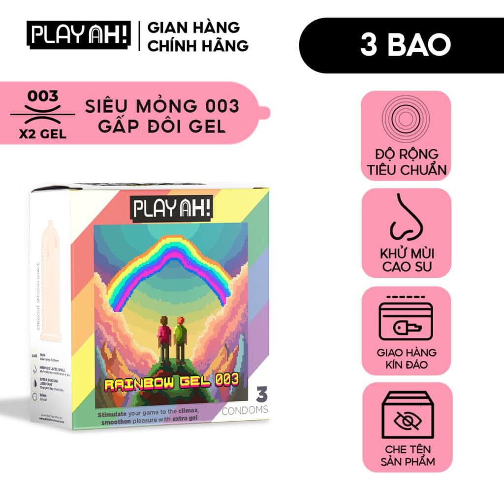Bao Cao Su PlayAh Rainbow Gel 003 siêu mỏng, nhiều gel – Hộp 3 bao